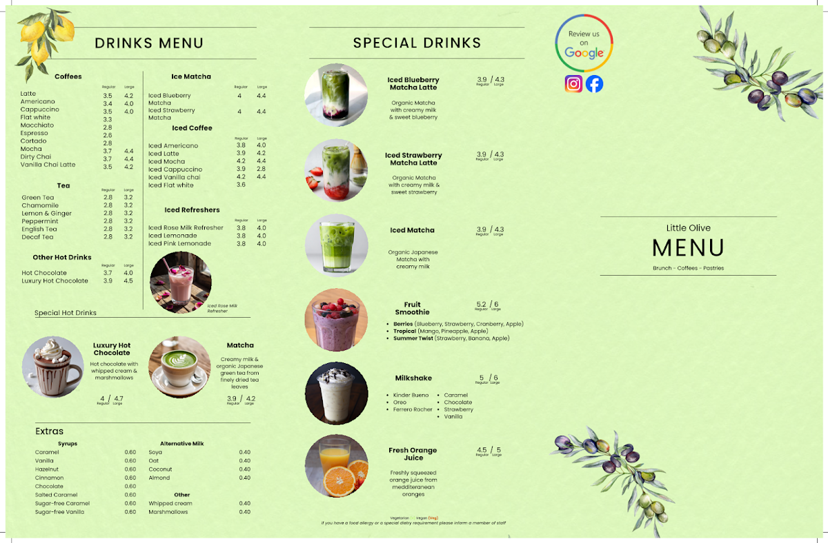 For coffee aficionados, Little Olive serves a wide array of brews, including the much-loved Latte (£4.20) and Cappuccino (£4.00). Each cup is crafted to perfection, promising a balanced blend of flavors to jumpstart your day. If you're in the mood for something refreshing, don't miss their iced refreshers like the luscious Iced Rose Milk Refresher (£3.80) or the zesty Iced Lemonade (£3.80) — perfect for those warmer days!